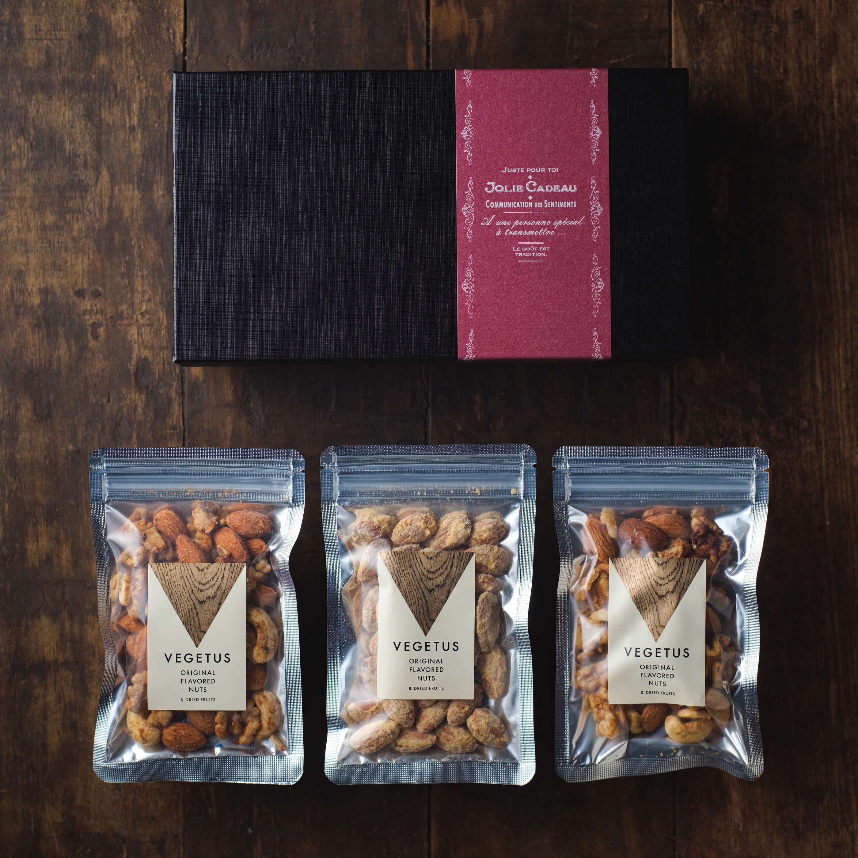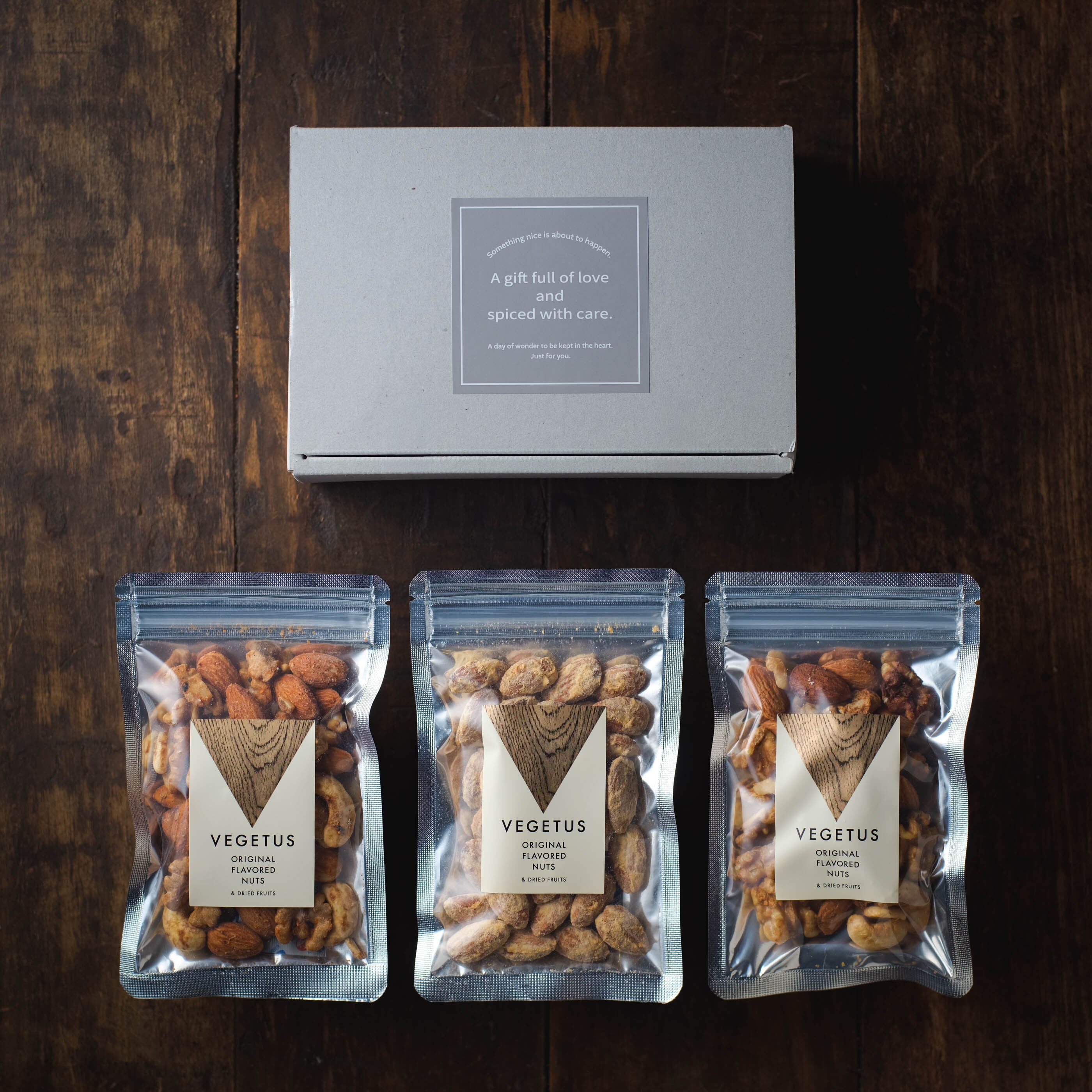 香りと旨みの余韻を愉しむ、大人のためのナッツアソート。日本酒に寄り添う三つの味わいを詰め合わせ、贈る方の想いに合わせて選べるギフトボックスに仕立てました。