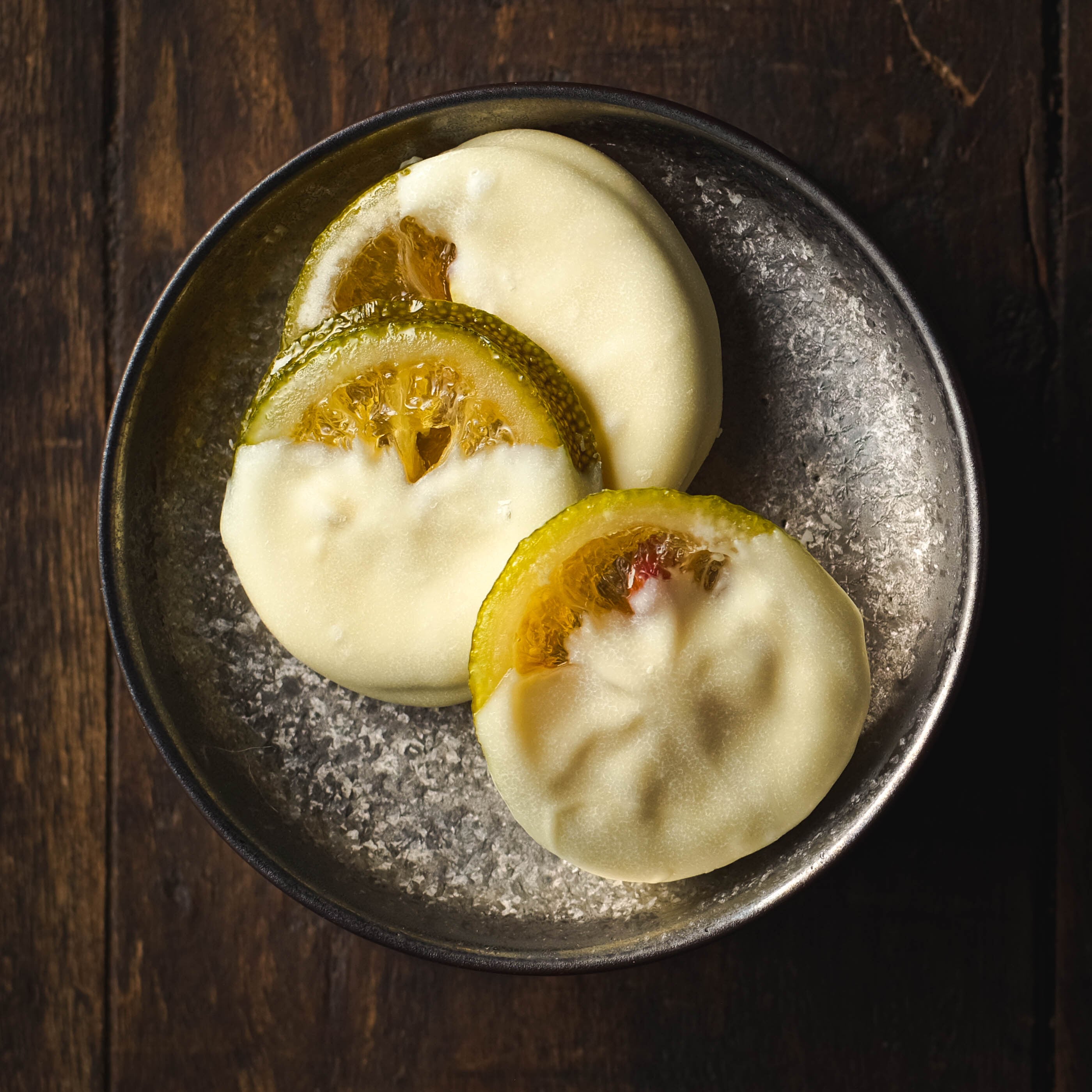 通常、グリーンレモンは加熱すると茶色く変色しやすい果実ですが、ここでは色・香り・酸味を保つために、高温を避け、極めてゆっくりとした火入れを採用。