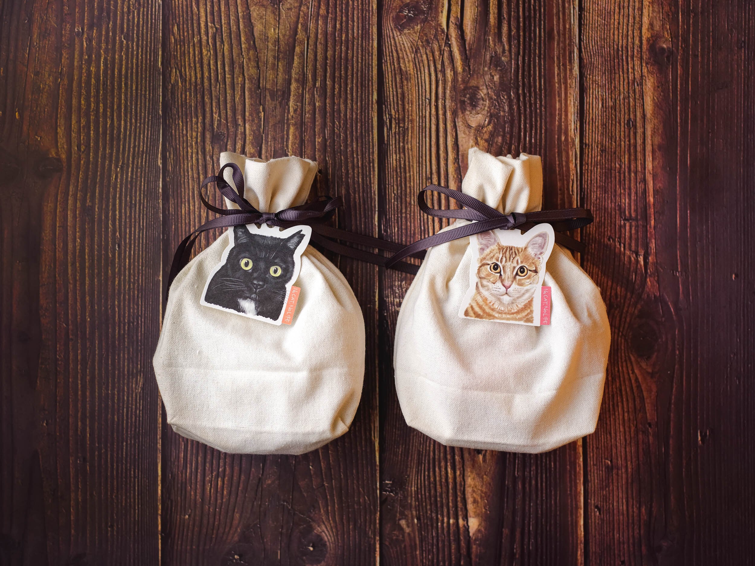 可愛らしいシンプルな巾着にネコタグがついています。
